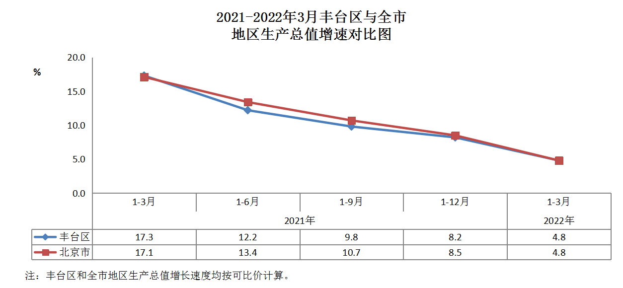 2021-2022年3月丰台区与全市地区生产总值增速对比图