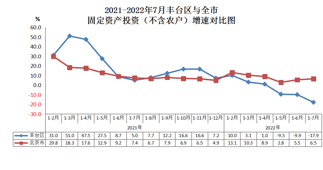 2021-2022年7月丰台区与全市固定资产投资(不含农户)增速对比图