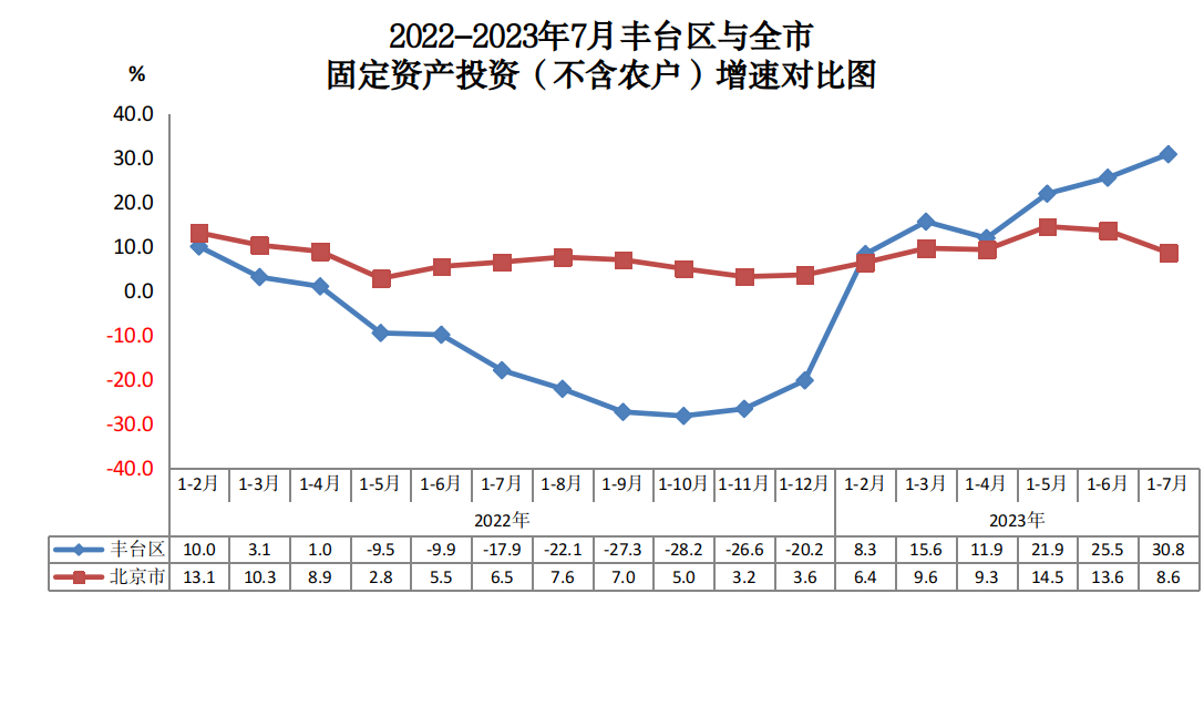 2022-2023年7月丰台区与全市固定资产投资(不含农户)增速对比图