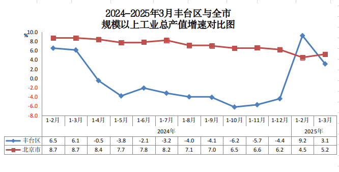 2024-2025年3月丰台区与全市工业总产值增速对比图