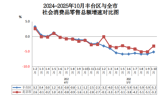 2024-2025年10月丰台区与全市社会消费品零售总额增速对比图
