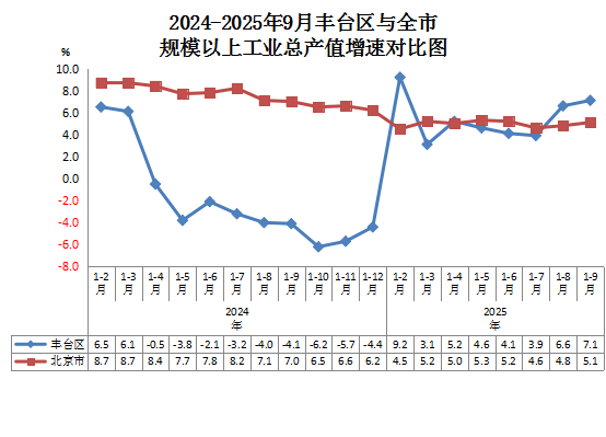 2024-2025年9月丰台区与全市规模以上工业总产值增速对比图
