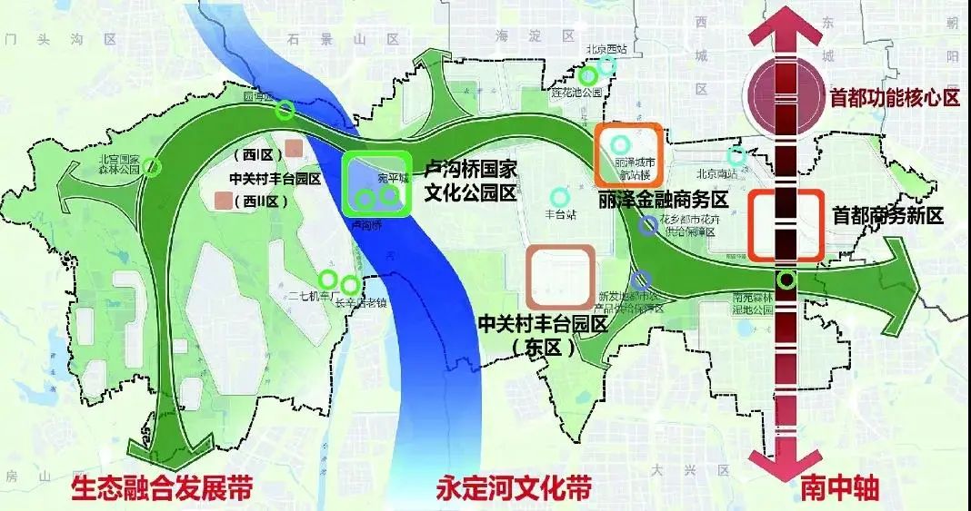 丽泽金融商务区、中关村丰台园和首都商务新区是丰台区构建特色发展新格局的“三大重点区域”。
