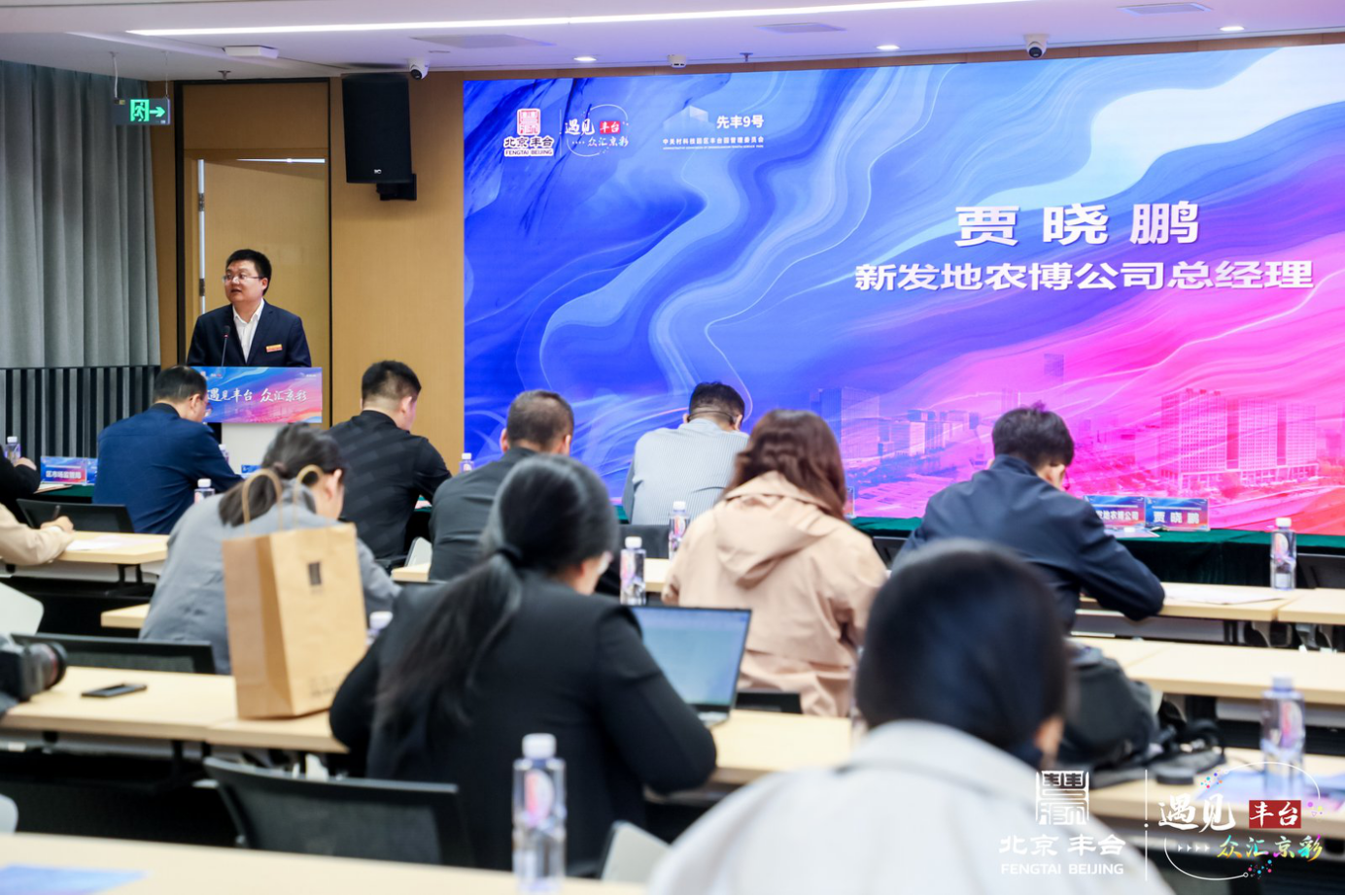 新发地农博公司总经理贾晓鹏介绍新发地市场集采集配服务情况。