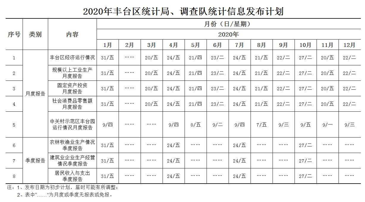2020年丰台区统计局、调查队统计信息发布计划