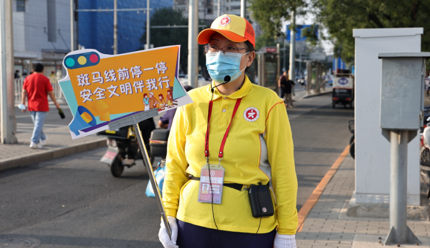 在辖区翠林路口,身着黄马甲、手拿指挥旗的“文明引导员”格外抢眼。