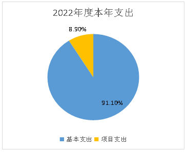 2022年度本年支出合计2301.14万元,比上年减少138.13万元,下降5.67%,其中:基本支出2095.2万元,占支出合计的91.1%;项目支出205.94万元,占支出合计的8.9%;上缴上级支出0.00万元,占支出合计的0.00%;经营支出0.00万元,占支出合计的0.00%;对附属单位补助支出0.00万元,占支出合计的0.00%。