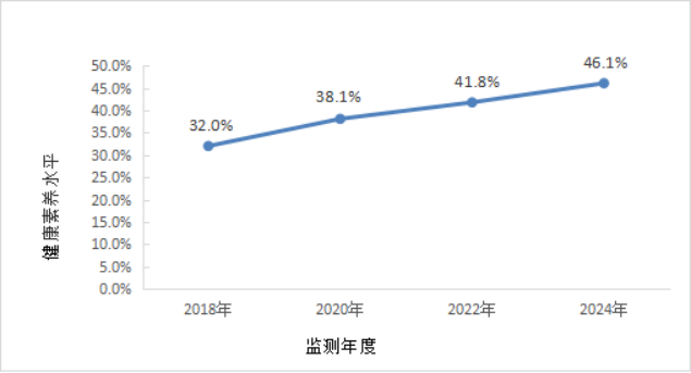 2024年丰台区居民健康素养水平达46.1%,达到7年来最高水平,高于北京市平均水平(44.6%)。自2018年起,丰台区对辖区居民健康素养水平开展了4次规律性监测,本次数据较2018年首次监测(32.0%)提高16.1个百分点(见图1)