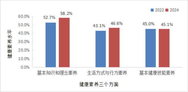 健康素养三个维度中,基本知识和理念、健康生活方式与行为、基本健康技能均有不同程度的提高,其中基本知识和理念素养水平最高,且增幅最大,由2022年的52.7%上升到2024年的58.2%(见图2)。