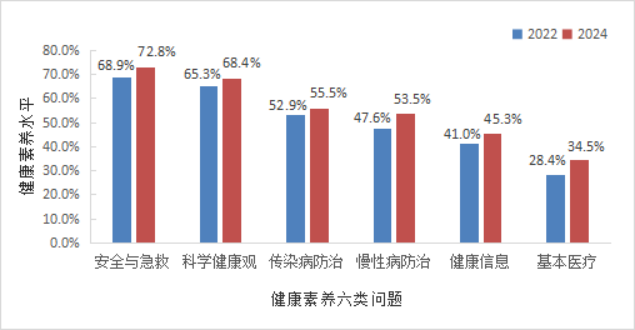 六大类健康问题素养水平中,排在前三位的是安全与急救、科学健康观、传染病防治,与2022年相比,六类健康问题素养均有不同程度的增长,其中增幅前三位的是基本医疗、慢性病防治、健康信息,分别增长6.1、5.9、4.3个百分点(见图3)。