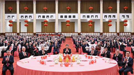 人民大会堂宴会厅灯光璀璨、喜气洋洋,各界人士齐聚一堂、共迎新春,现场洋溢着欢乐祥和的节日气氛。