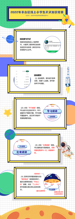 为进一步推动丰台区小学天文基础教育,培养更多青少年仰望星空,区科信局于11月29日开展丰台区小学生线上天文知识竞赛活动,请各学校高度重视,协助做好本次竞赛活动的宣传发动工作,积极组织学生参加。现将相关事宜通知如下: