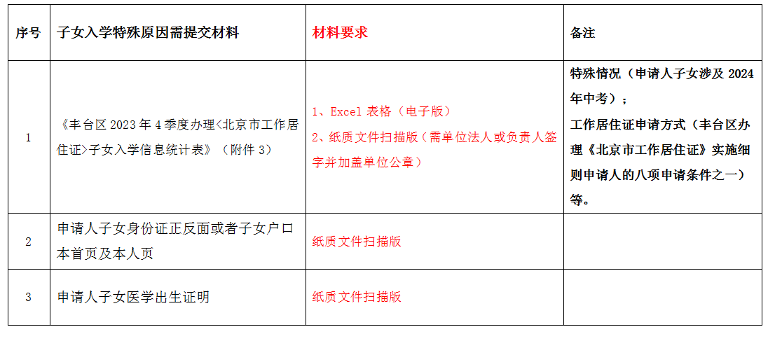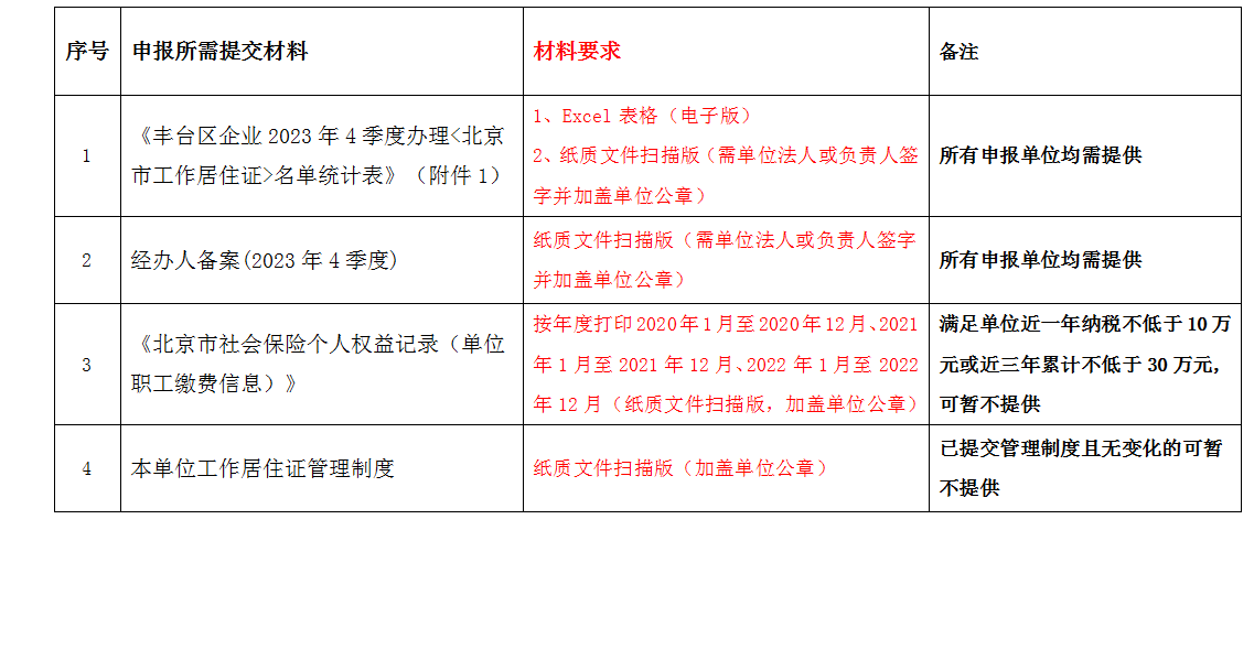 (二)《丰台区企业2023年4季度办理<北京市工作居住证>名单统计表》(附件1)、《丰台区2023年4季度办理<北京市工作居住证>子女入学信息统计表》(附件3)需提供电子版和纸质文件扫描版,纸质文件扫描版需单位法人或负责人签字并加盖单位公章,其他材料只需提供电子版或扫描件即可。