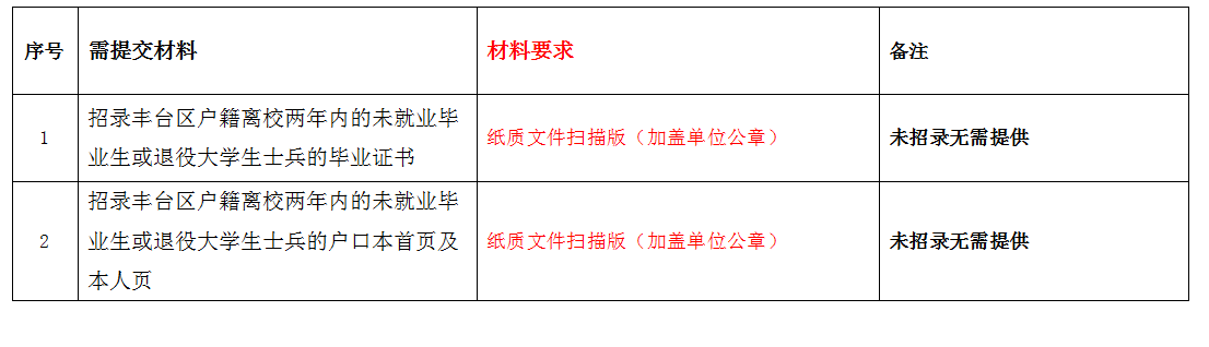 (三)单位近两年招录丰台区户籍离校两年内的未就业毕业生或退役大学生士兵除上述材料外还需将以下材料发送至邮箱: