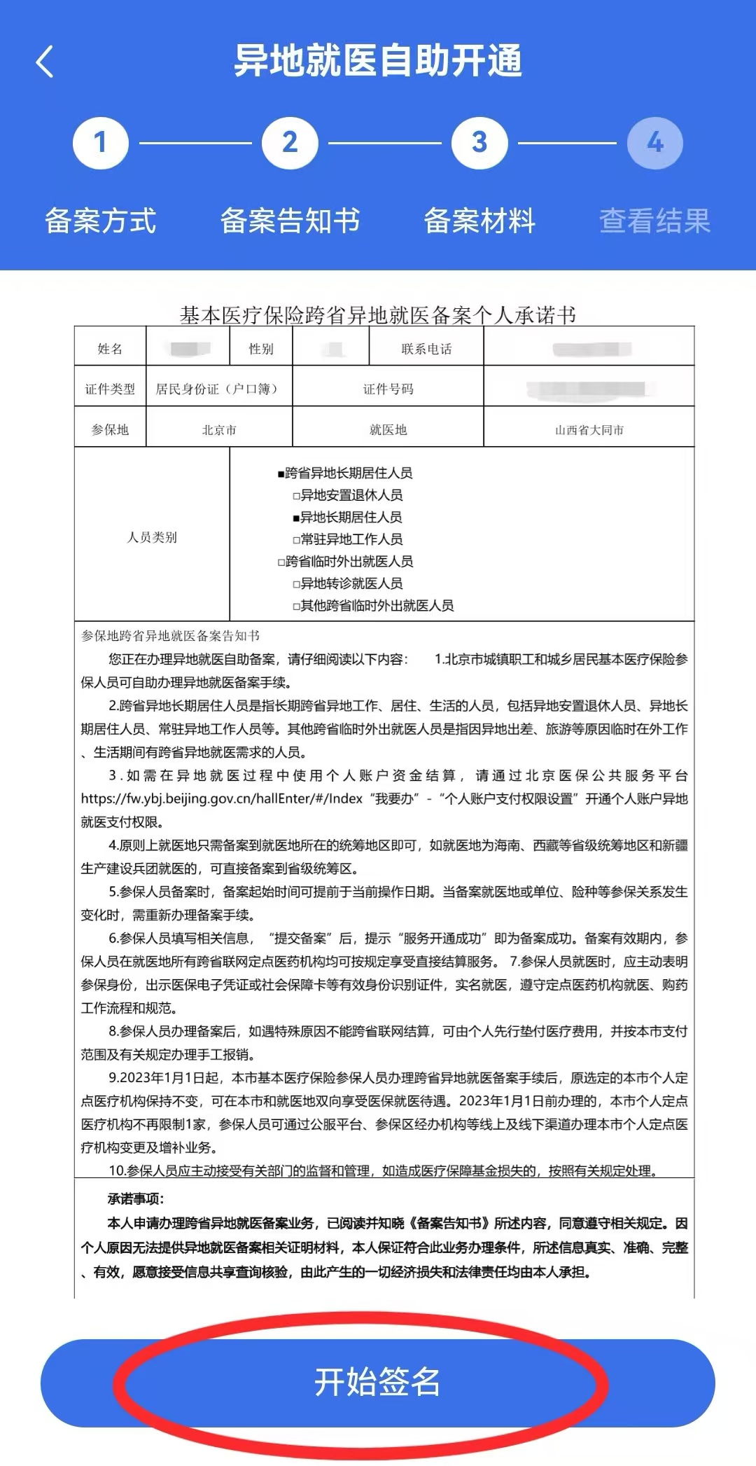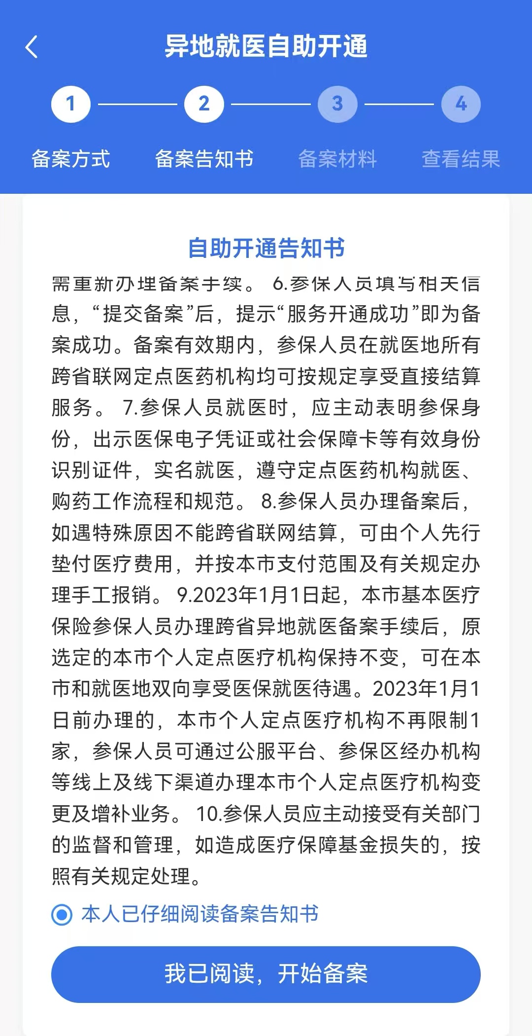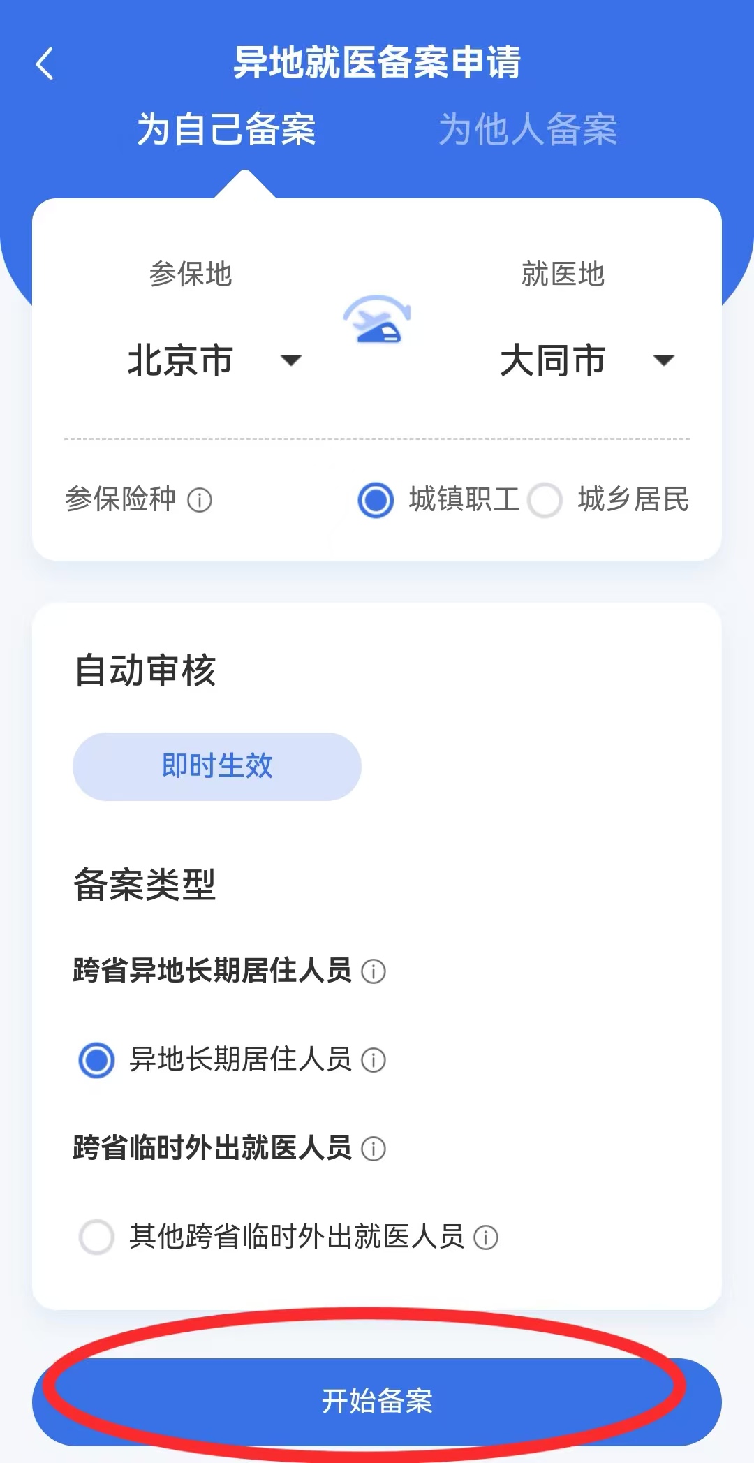 3.按个人异地就医需求完善相关信息后点击“开始备案”