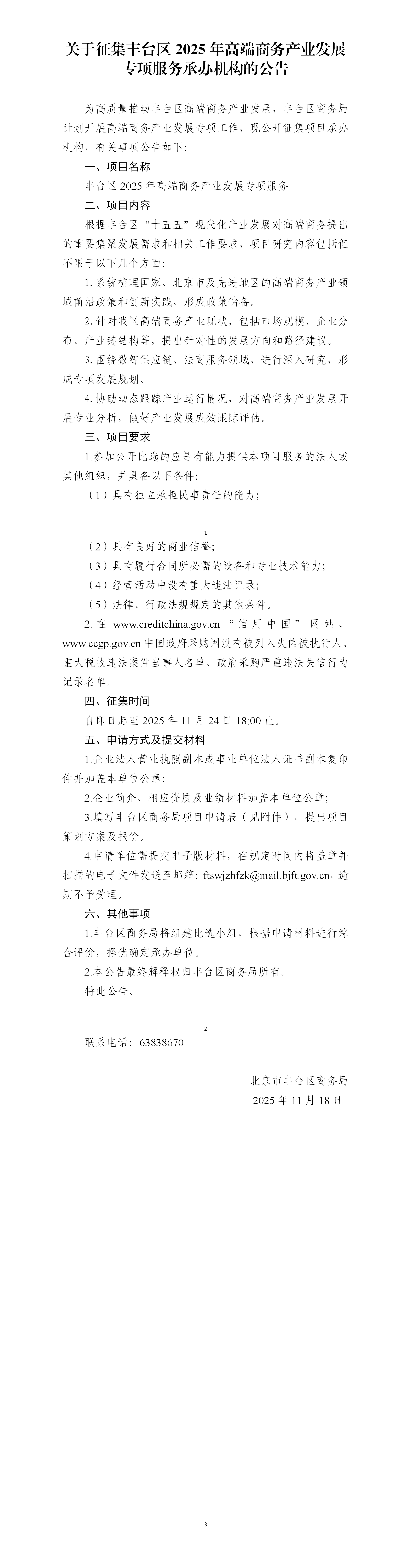关于征集丰台区2025年高端商务产业发展专项服务承办机构的公告