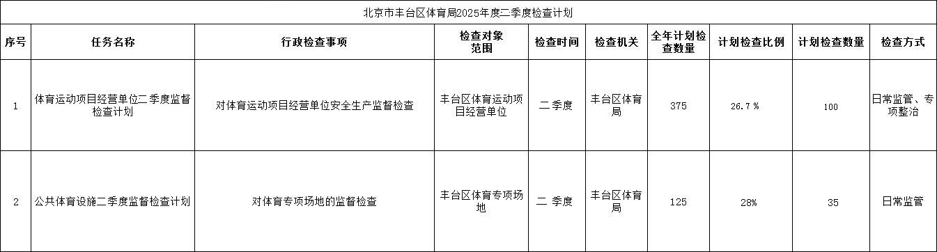 一、详见附件:丰台区体育局2025年第二季度行政执法检查计划