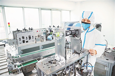 2月24日下午,记者在依文集团的生产车间看到,两条口罩全自动生产线正在安装测试,密密麻麻的零部件让人眼花缭乱,技术人员忙着进行调试。预计下周投入生产,日产能20万只,用于解决复工复产企业的口罩需求。