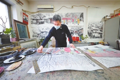 2月25日,记者来到路海艇的画室进行采访,只见画室不大、满满当当,宽大的画案和满墙的作品让记者感到他是一个笔耕不辍的画家,他正俯身画案刷刷点点。“你看这幅作品,叫职守,社区干部戴着红袖章正在给进出的居民群众测量体温,画面上的城楼就是咱丰台的宛平城。”路海艇向记者介绍刚刚创作完成的作品《职守》。画面上的人物都戴着口罩,桌子上靠着一块提示牌,上面写着:请自觉配合测量体温,返京人员请登记。画面左上角一条横幅写着:众志成城 抗击疫情。墙上还挂着一幅作品,画的是两名戴着口罩红袖标的志愿者正在给行人测量体温,墙上红底白字的标语非常醒目:疫情就是命令,防控就是责任。“这是画的丰台区东高地万源路的北门,咱们身边的人、身边的事。”路海艇介绍说。