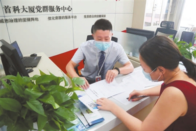 首科大厦党总支书记、总经理沈艳婷说:“党群服务中心引进了政务服务站,可谓是首科楼宇‘党建+5D’模式中‘党建+双向服务’的生动实践,我们的入驻企业办理政务事宜更方便了,足不出户完成办理,办理过程中工作人员也很专业,可以一次性为客户说明材料清单和填写的注意事项。”