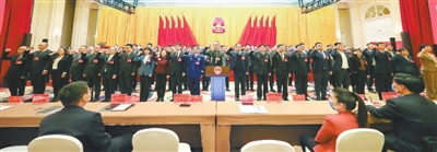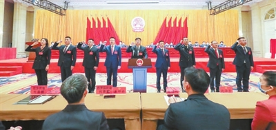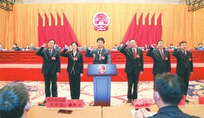 新当选的丰台区第十七届人大常委会主任、副主任进行宪法宣誓。