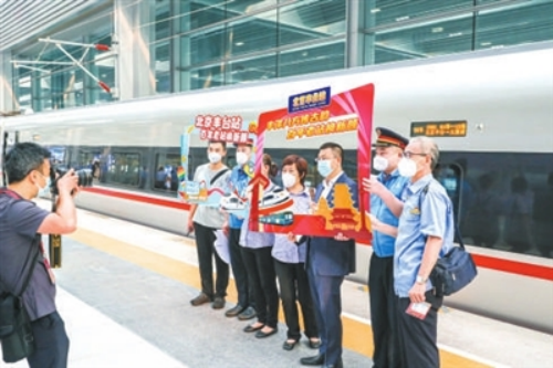 首发列车长于淼说:“今天是北京丰台站开通运营的第一天,作为首发车班组非常荣幸,我们在列车行进过程中还会通过新老丰台站的照片,带着旅客一同回顾北京丰台站的建设历程。”图为首班车乘客在站台合影留念。