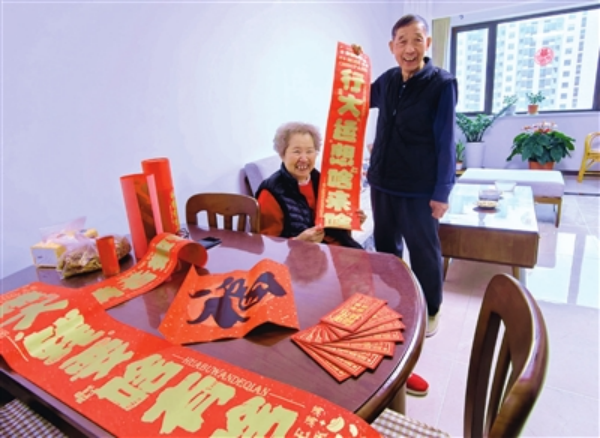 在居民杜文峰的家里,记者看到他正在和老伴儿一起选对联、贴福字,火红的福字窗花贴在大大的阳台玻璃窗上,新年的喜庆立马传递开来。阳台放着海棠、红掌、虎皮兰等各种花草,在大红福字的映衬下更显春意盎然。“我们老两口带着外孙女住1门,女儿女婿住2门,咱这一梯就两户,这一层就是我们一家人,吃饭的时候他们就过来,平时照应都方便。”杜大爷告诉记者,他们一家人是1月12日搬入新居的,目前家里的年货也都准备得差不多了,上午一早女儿一家三口又开车出去继续置办年货了,“乔迁之喜遇上过新年,可以说是喜上加喜,孩子们愿意多准备准备,我们也一起跟着高兴。”杜大爷说。