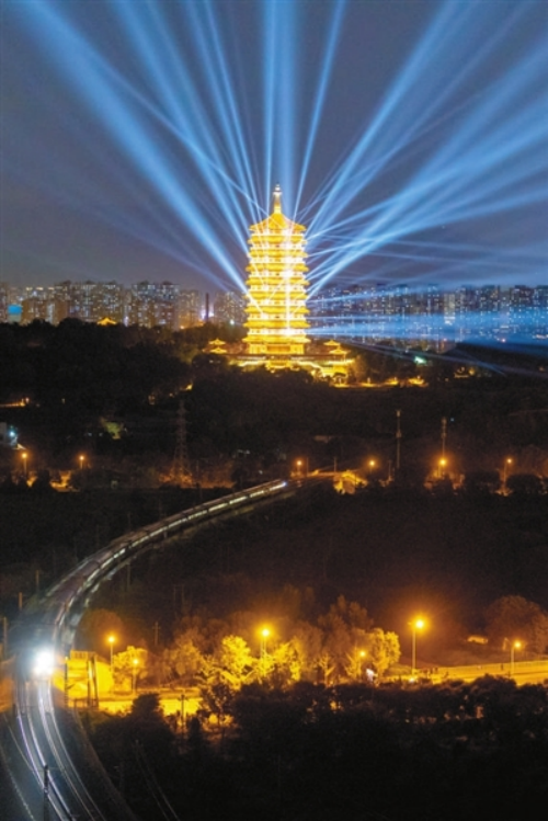 北京中秋国庆“京彩灯会”于9月14日在北京园博园正式亮灯,近日记者来到园博园周边探访。夜幕下,被点亮的永定塔熠熠生辉,一列火车疾驰而过,在灯光下别有一番意境。姜灏 摄
