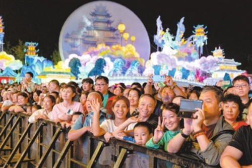 园博园3号门广场上,观众在花灯前观看演出,感受传统文化魅力。姜灏 摄
