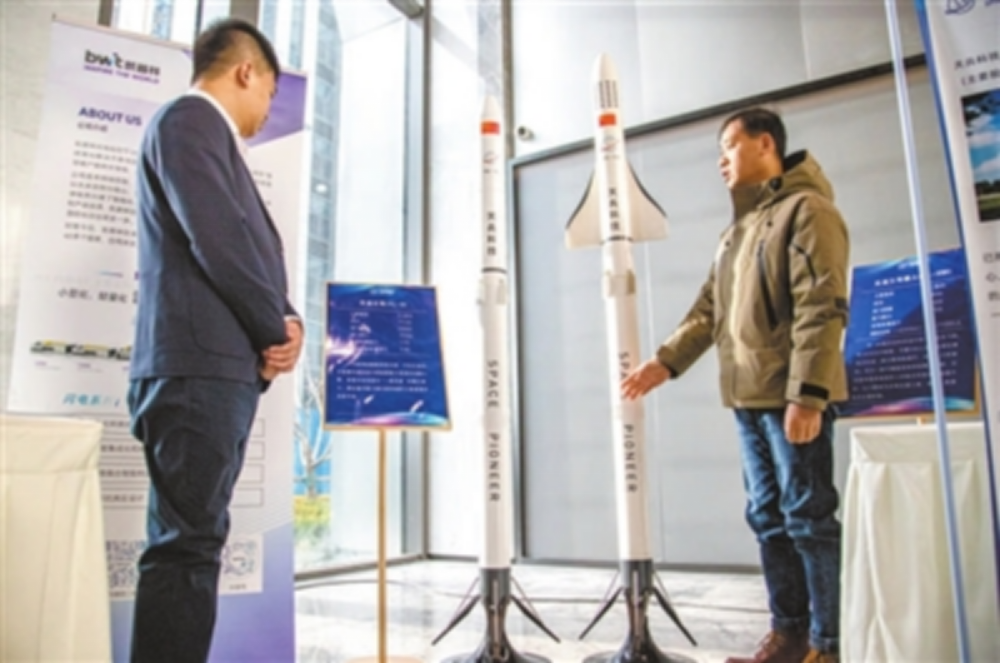 在丰台区民营企业科技创新成果展上,工作人员介绍商业航天展品