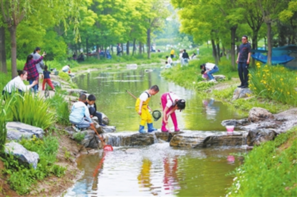 南苑森林湿地公园作为无界公园免费开放,吸引众多居民前来游玩,图为正在捞鱼的小朋友。赵辉 摄