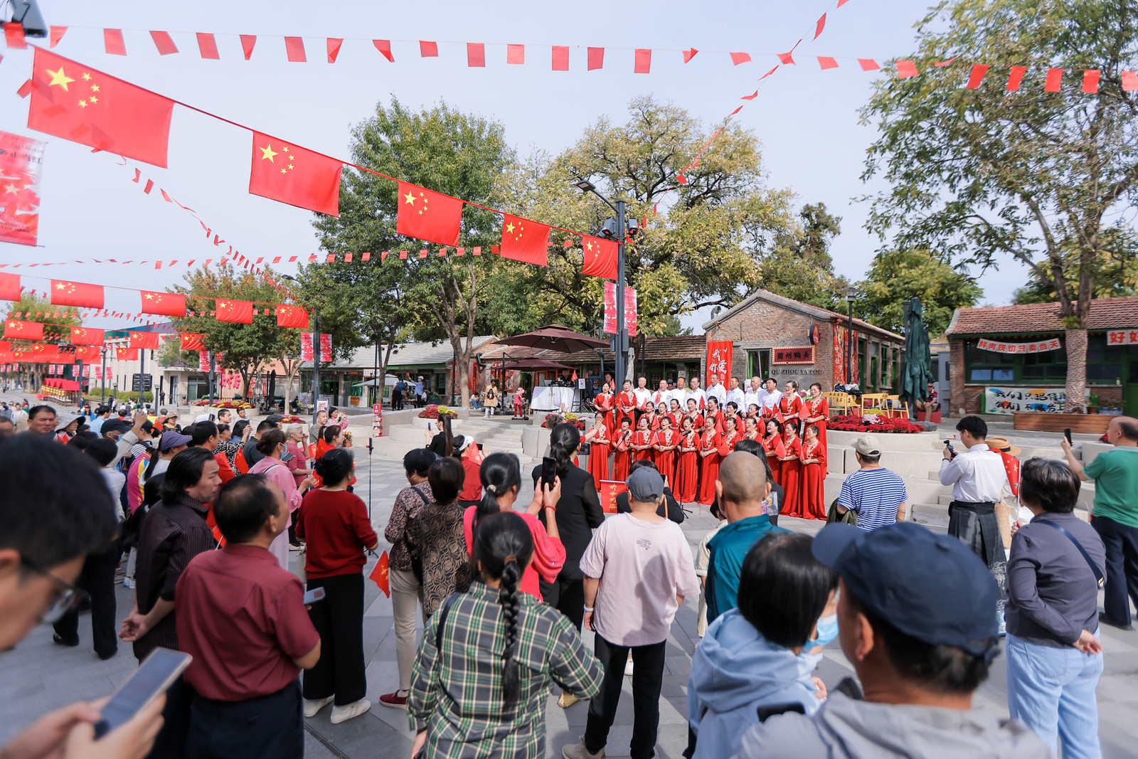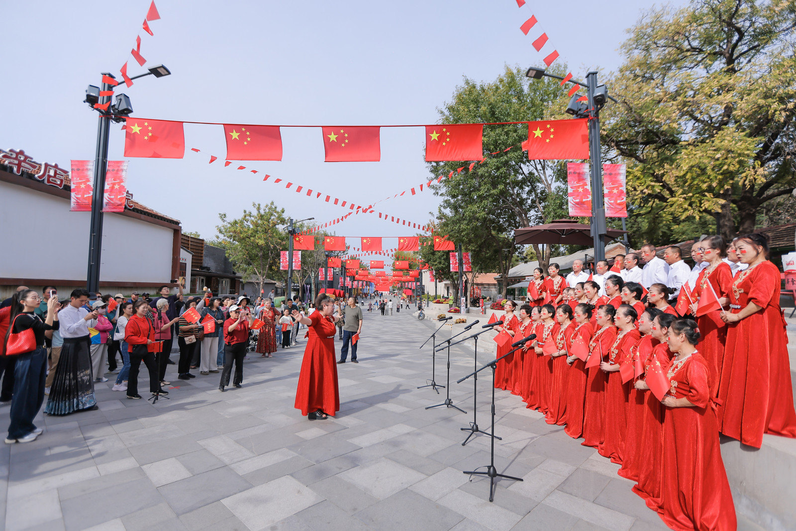 当天,街区广场上挂起了一面宽9米、高6米的巨型国旗,青砖灰瓦间,鲜艳的五星红旗与国潮灯笼的暖光交相辉映,构成一幅震撼人心的时代画卷。游客们纷纷聚集在国旗下,举起手机定格“中国红”。游客感慨道:“中国红已经融入了长辛店红色血脉,也是新时代国潮的底色。”
