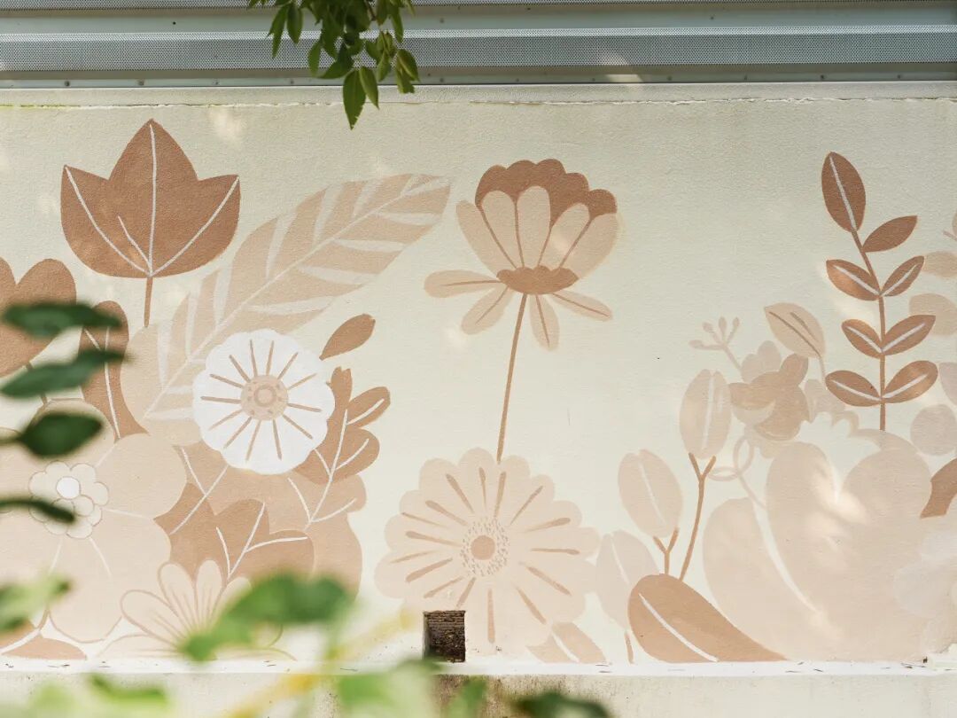 除了历史文化,花乡还把“鲜活的生活艺术”“搬”上了墙面!沿着街道慢行,浅棕、裸粉等低饱和度的花卉图案在浅米色墙面上肆意舒展,叶片与花瓣的线条柔和又治愈。无论是清晨赶路,还是傍晚散步,路过这里都像在与“自然温柔对话”,随手一拍,都是清新感拉满的文艺大片。