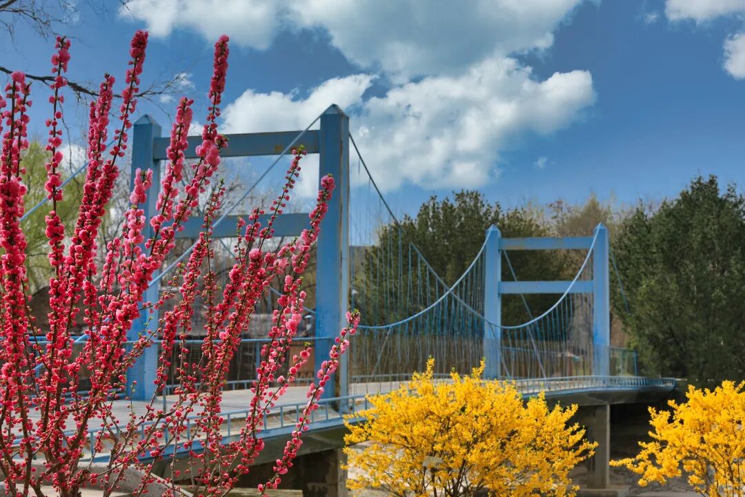 碧桃和连翘在桥边开的正茂盛
