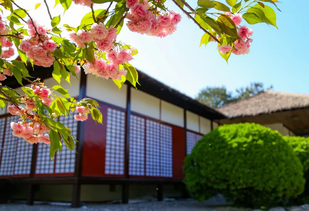 重瓣樱花常与日式庭院、中式古建搭配出镜,粉花黛瓦、檐角花影的组合极具东方美学氛围感~