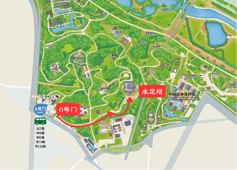 直接冲6号门!进门右转沿主干道一直走,遇到十字路口不转弯向前!直线直达不绕弯,鹰山山路弯弯绕,千万别走到北门,离塔超远!