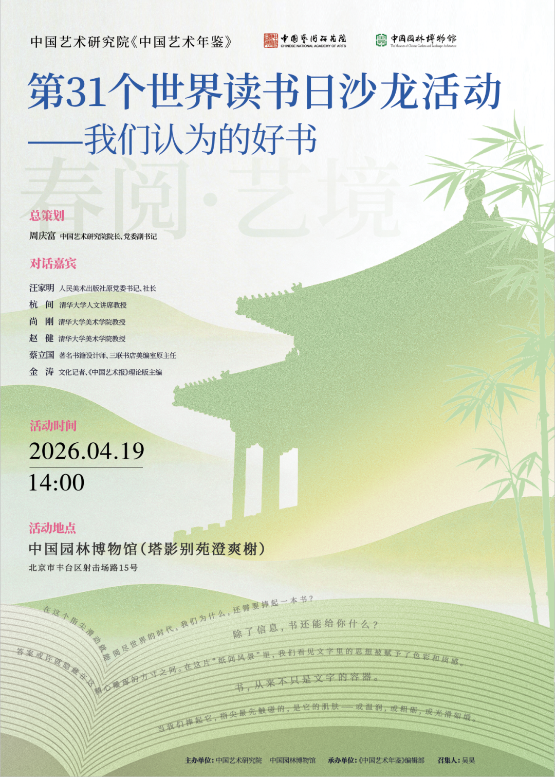 4月19日,第二场「我们认为的好书」主题沙龙将在中国园林博物馆室外展区塔影别苑澄爽榭如约而至。