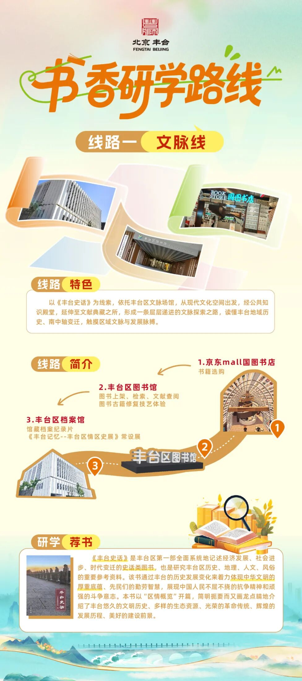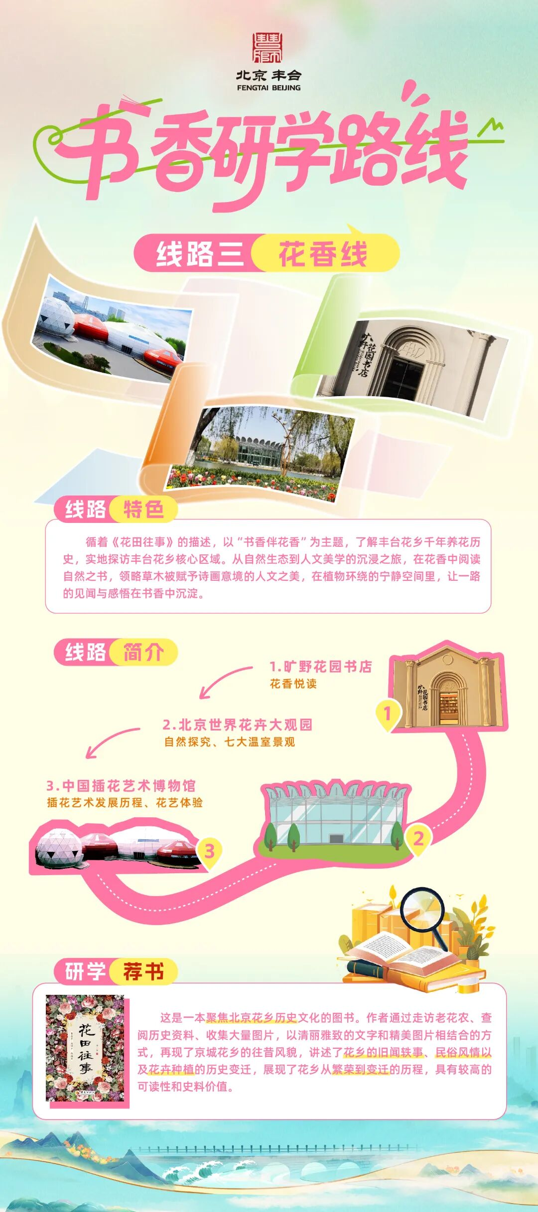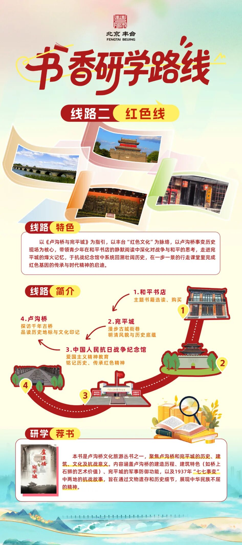 春日渐暖,书香满城。在4·23世界读书日(全称为 “世界图书与版权日”)到来之际,丰台区推出文脉、红色、花香、文博、生态、出版6条特色“书香研学”路线,把书本里的文字变成可触摸、可行走、可感悟的实景课堂。以脚步丈量丰宜福台,以阅读遇见城市底蕴,让书香与春光同行,让研学与成长相伴。