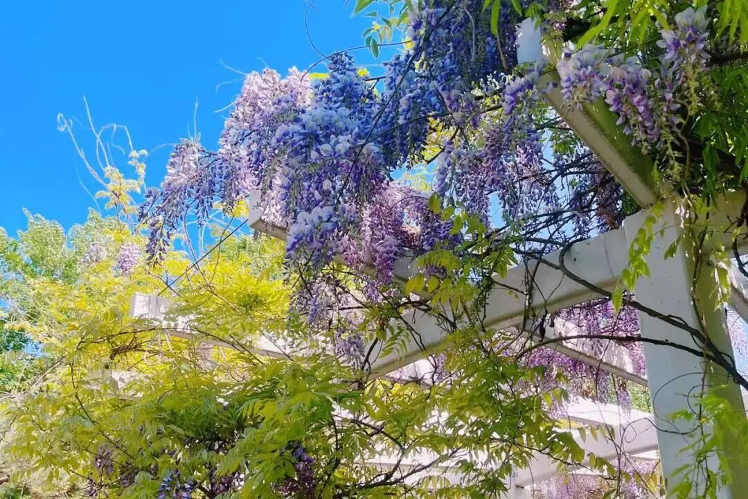 紫藤花的藤蔓缠绕着花架,一串串花穗垂落下来,朦胧又浪漫。