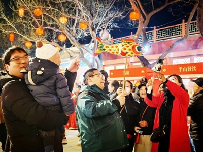 “孩子早就听说今晚有月全食,特意从网上查了观测时间。宛平城里红灯笼高挂,鱼灯巡游,还能看到真正的‘红月亮’,今晚太值了!”来自海淀的张女士带着女儿站在城楼上,母女俩仰头望着那轮从云层中挣脱出来的“红月亮”,眼中满是惊喜。