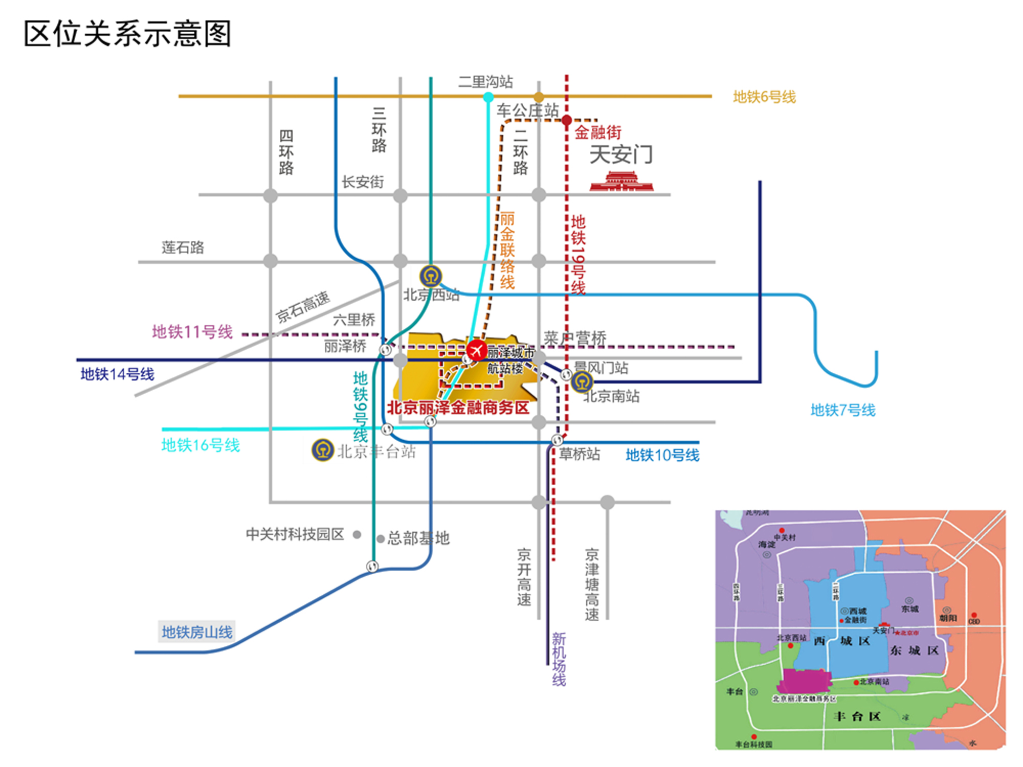 丽泽金融商务区汇聚五条地铁线,三个高铁站,一个城市航站楼。地铁14号线、16号线、丽-金线、新机场线、11号线交汇于此,10分钟可达金融街,20分钟可达大兴国际机场;商务区位于北京西站、北京南站和北京丰台站三大交通枢纽的中心位置,10分钟均可到达;高标准建设中的对外综合交通枢纽丽泽城市航站楼,率先实现区域交通一体化,为国内外商旅人士提供快速值机服务、行李托运。四通八达的交通基础设施,将促进丽泽金融商务区与世界互联互通,打造国际化金融商务区。
