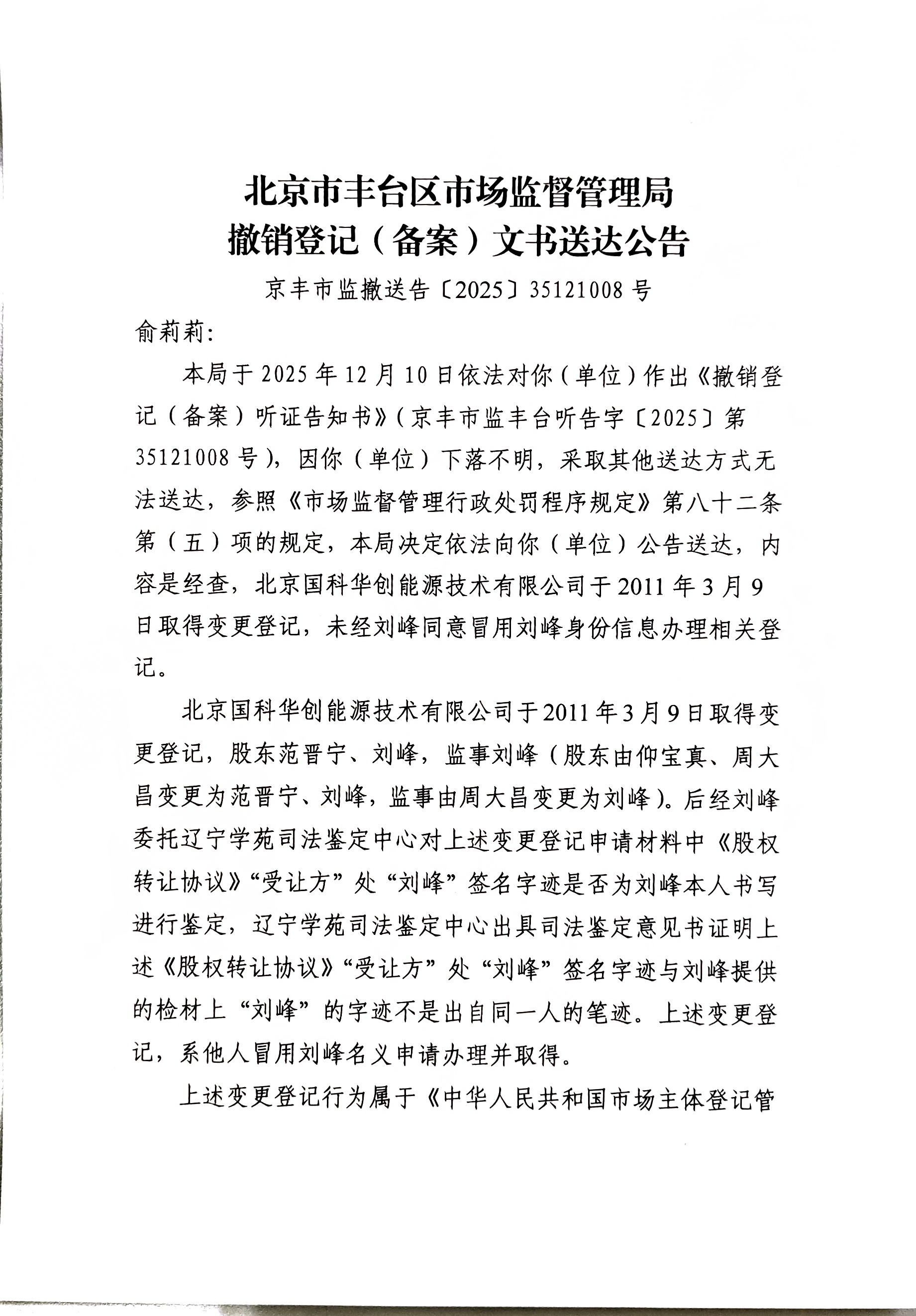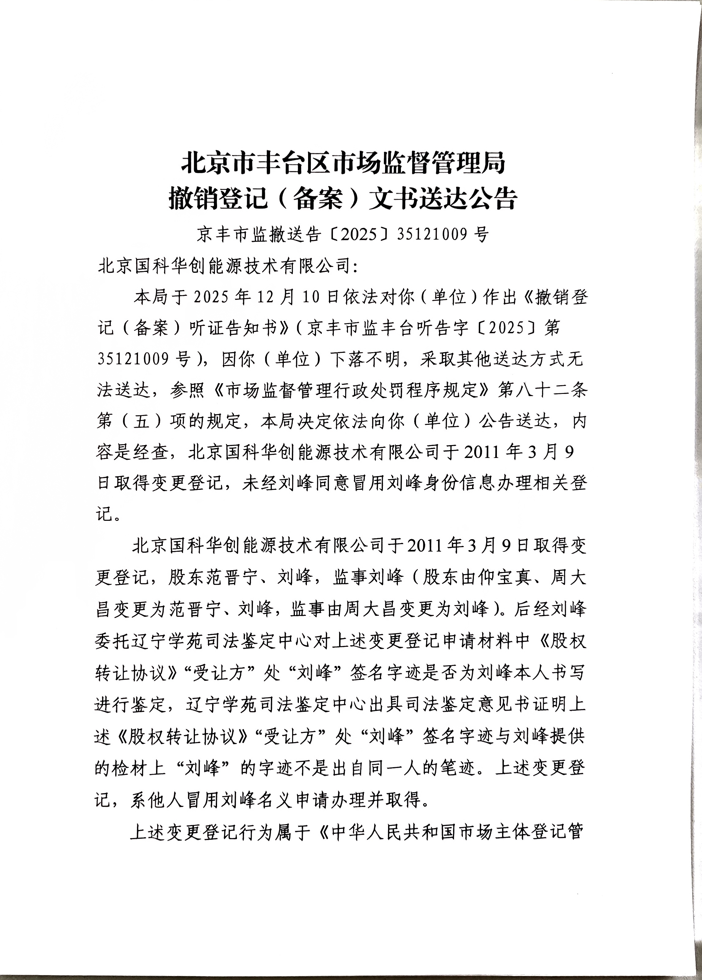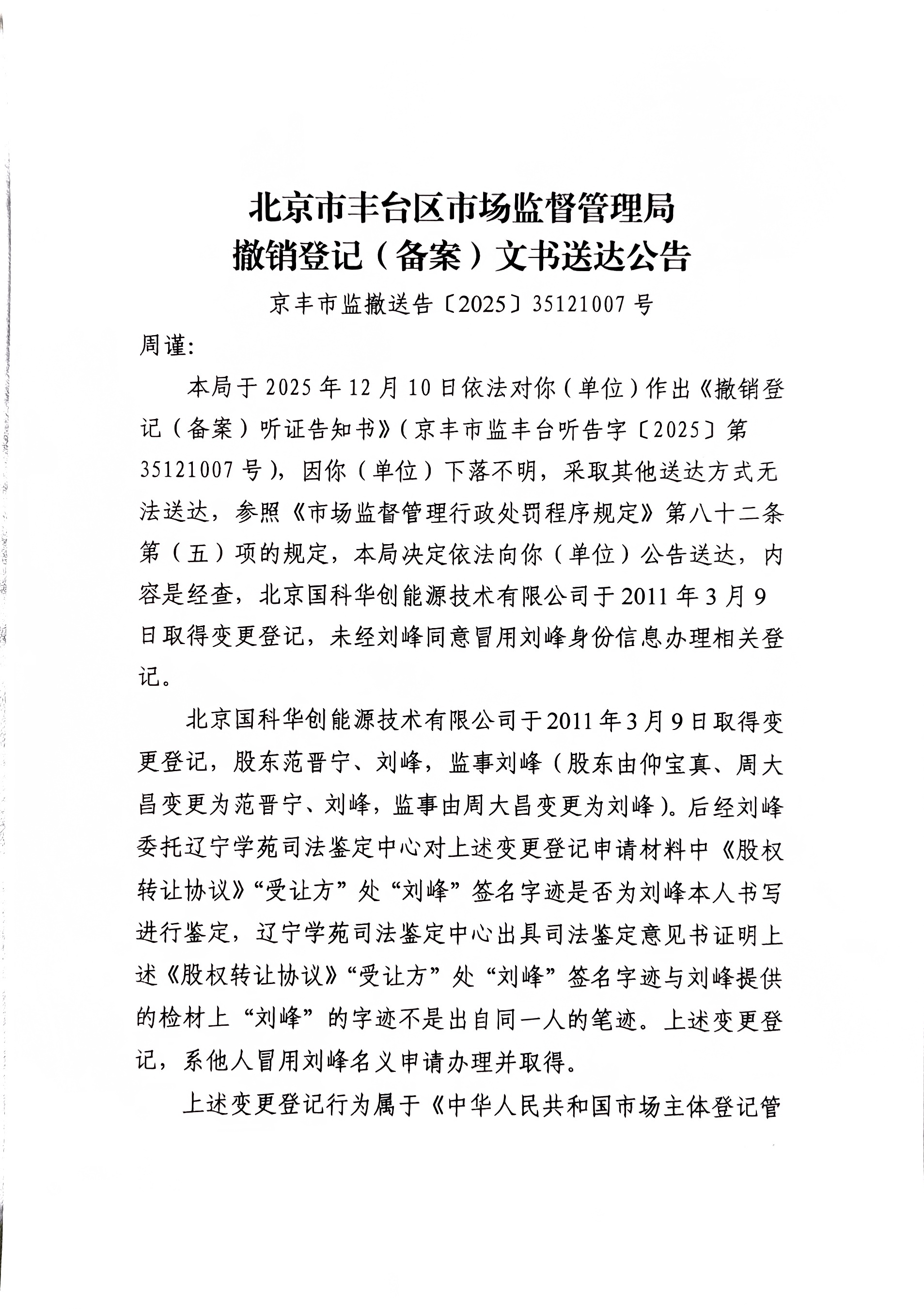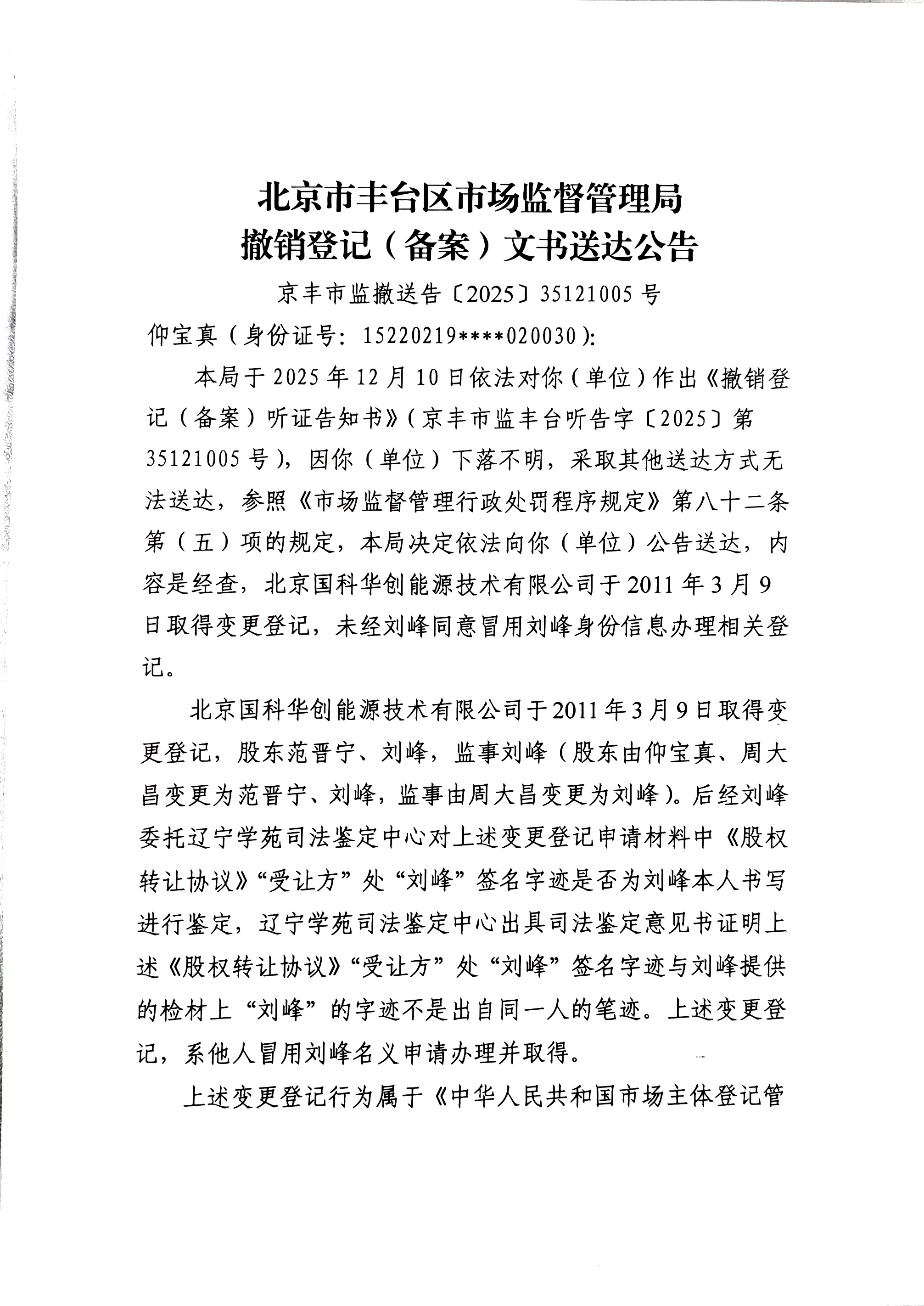 撤销登记(备案)文书送达公告-北京国科华创能源技术有限公司、仰宝真、周大昌、周洁、周谨、俞莉莉