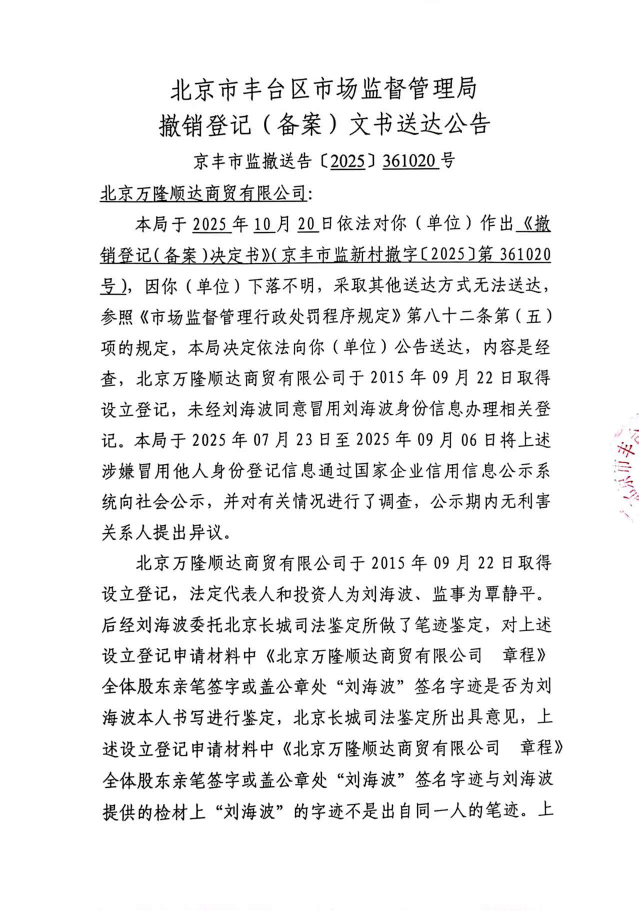 撤销登记(备案)文书送达公告-北京万隆顺达商贸有限公司-北京市丰台区人民政府网站