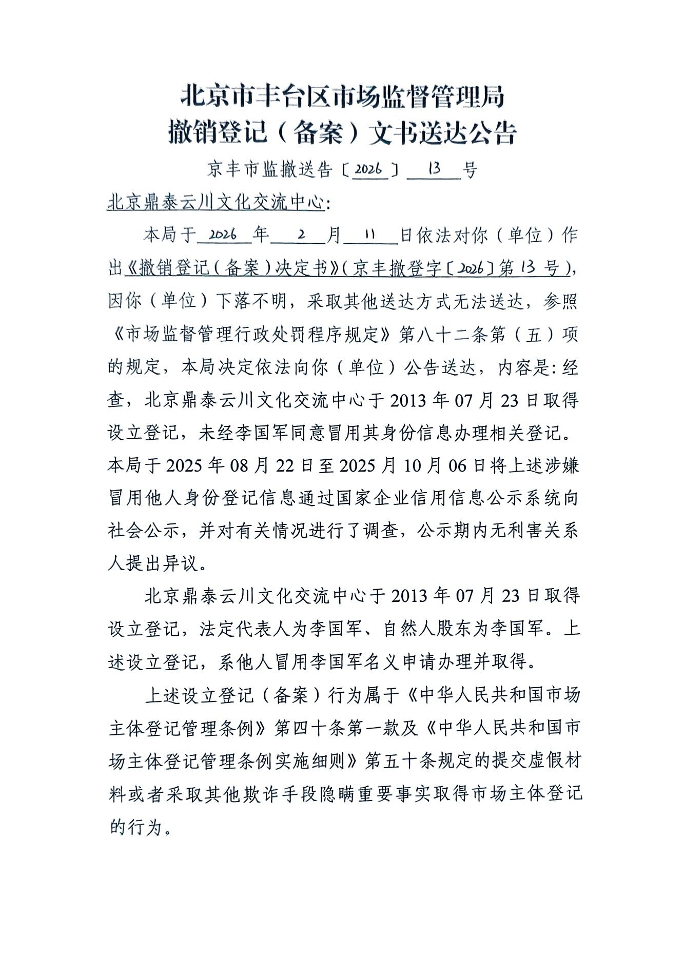 撤销登记决定书送达公告(北京鼎泰云川文化交流中心)-北京市丰台区人民政府网站
