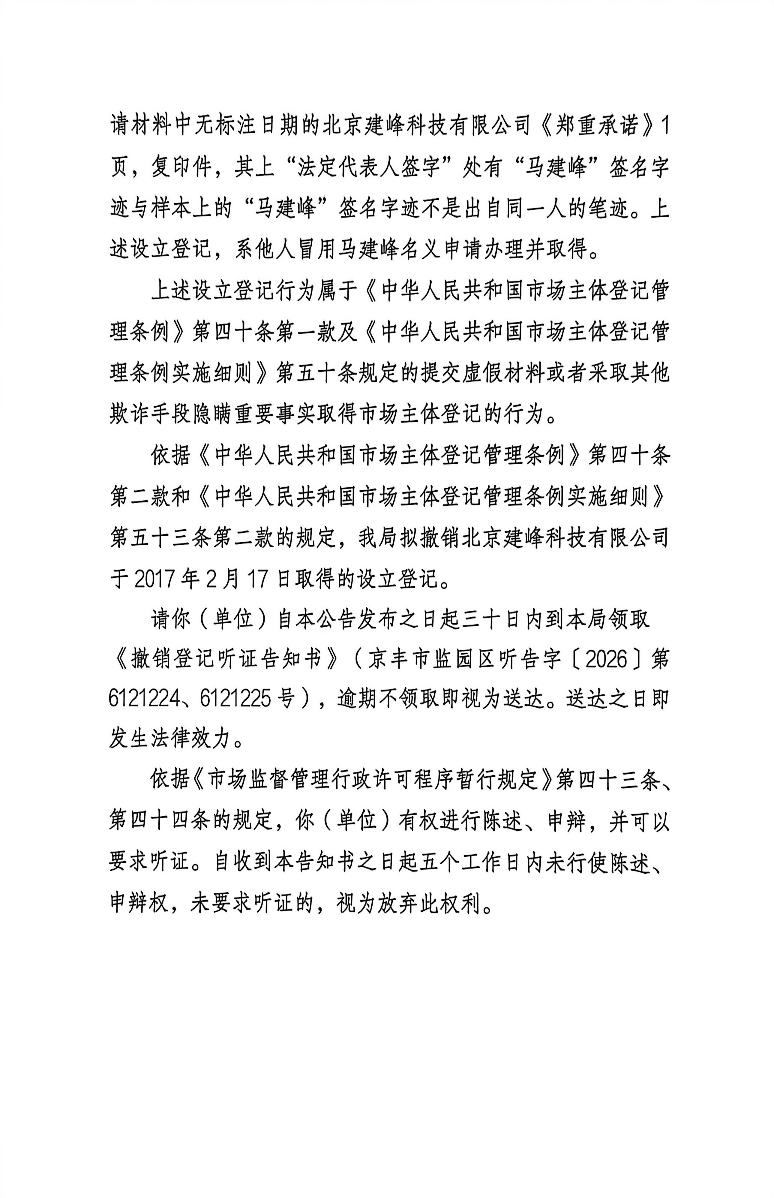 撤销冒名登记文书公告(北京建峰科技有限公司、孙伟伟)-北京市丰台区人民政府网站