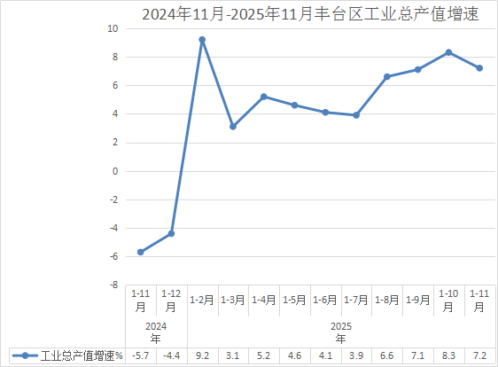 1-11月,丰台区规模以上工业企业实现工业总产值247.4亿元,同比增长7.2%。其中,现代制造业实现101.8亿元,同比增长2.0%;高技术产业实现35.8亿元,同比下降11.2%。