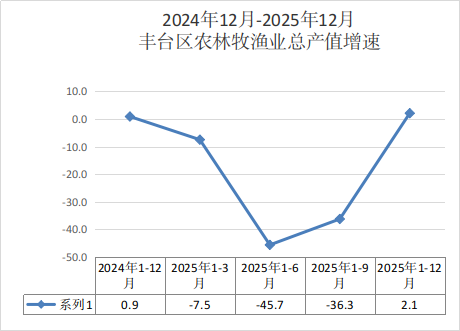 1-12月,丰台区实现农林牧渔业总产值18793.8万元,同比增长2.1%。其中,农业实现产值2476.0万元,同比增长3.1%;林业实现产值16201.1万元,同比增长2.0%;农林牧渔专业及辅助性活动实现产值116.8万元,同比持平。