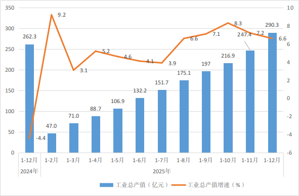 1-12月,大型企业累计实现工业总产值31.3亿元,同比增长12.7%;中型企业累计实现工业总产值96.8亿元,同比增长8.8%;小型企业累计实现工业总产值156.3亿元,同比增长4.2%;微型企业累计实现工业总产值5.9亿元,同比增长4.7%。
