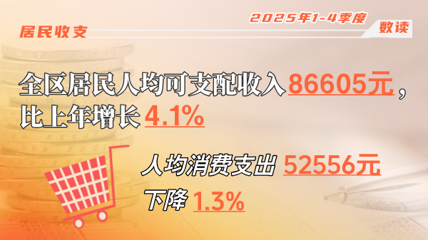 2025年全区居民人均可支配收入86605元,比上年增长4.1%。人均消费支出52556元,下降1.3%。