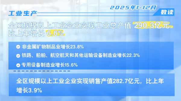 2025年全区规模以上工业企业实现工业总产值290.3亿元,比上年增长6.6%。从主要行业看,非金属矿物制品业增长23.8%,铁路、船舶、航空航天和其他运输设备制造业增长22.3%,专用设备制造业增长15.6%,电力、热力生产和供应业增长4.9%。
